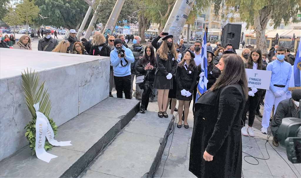 Την επιμνημόσυνη δέηση τέλεσε ο Πρωτοσύγκελος της Ιεράς Αρχιεπισκοπής Κρήτης Μεθόδιος Βερνιδάκης, ενώ στο μνημείο κατέθεσαν στεφάνια οι: Αντιπεριφερειάρχης Παιδείας Δια Βίου Μάθησης Απασχόλησης και Νέας Γενιάς Έφη Κουτεντάκη, η Αντιδήμαρχος Παιδείας Στέλλα Αρχοντάκη, ο Περιφερειακός Διευθυντής Εκπαίδευσης Κρήτης Μανόλης Καρτσωνάκης, οι Διευθυντές Πρωτοβάθμιας Μανόλης Μπελαδάκης και Δευτεροβάθμιας Εκπαίδευσης Ιωάννης Καραγιαννίδης, εκπρόσωποι μαθητών Δημοτικών, Γυμνασίων και Λυκείων Ηρακλείου, του ΕΛ.ΜΕ.ΠΑ. του Σώματος Ελληνικού Οδηγισμού και των Προσκόπων.