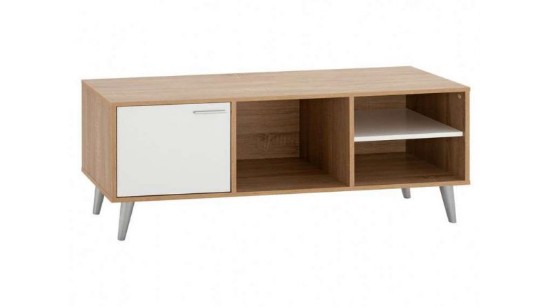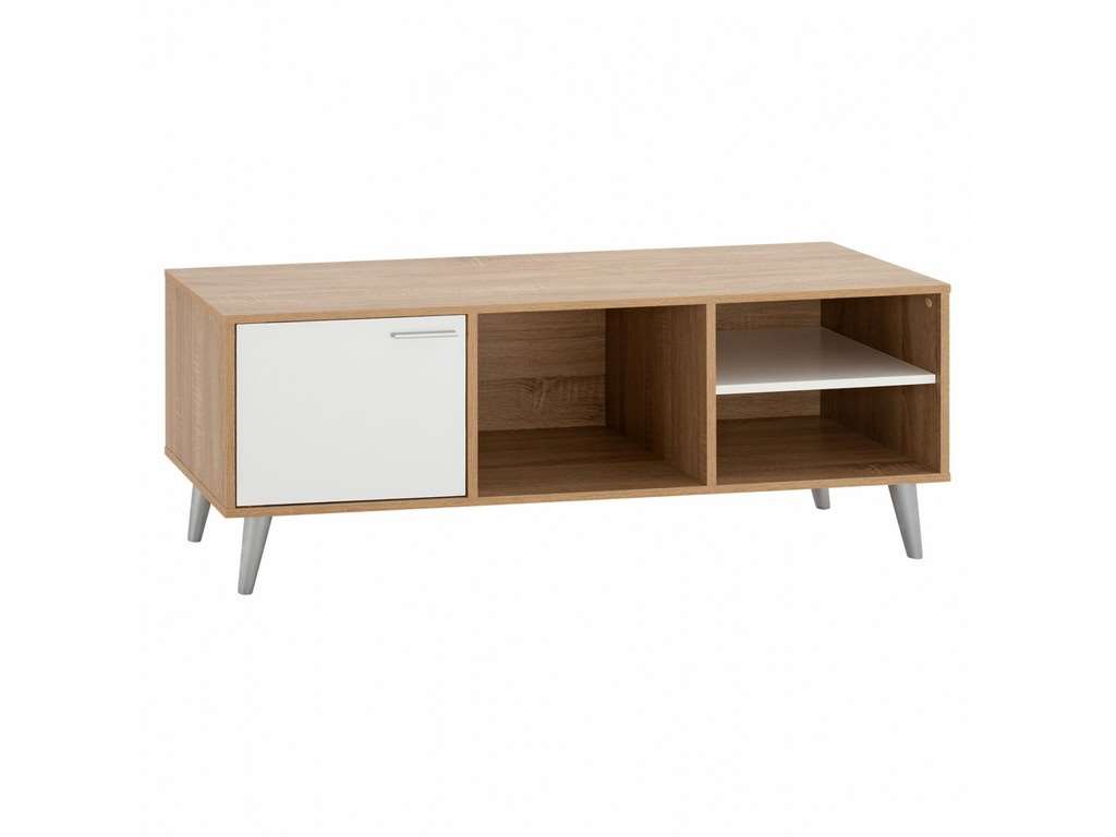 Έπιπλο τηλεόρασης κατασκευασμένο από μελαμίνη σε λευκό και sonama χρώμα, με ένα ντουλάπι και ειδικά διαμορφωμένα ράφια για να τοποθετούνται ηλεκτρονικές συσκευές ή διακοσμητικά. Ο μοντέρνος και λιτός σχεδιασμός, είναι κάποια από τα χαρακτηριστικά που ζητάς για να απογειώσεις την αισθητική του χώρου σου, προσφέροντας παράλληλα και πρακτικότητα.