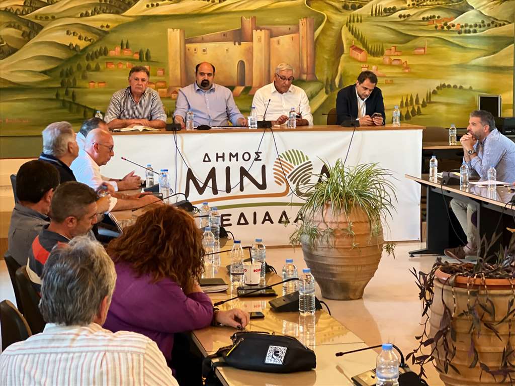 Κατά την επίσκεψή του, ο Υφυπουργός στον Πρωθυπουργό πραγματοποίησε συνάντηση εργασίας στο Δημαρχείο Μινώα Πεδιάδας στο Αρκαλοχώρι με τον Δήμαρχο κ. Μανώλη Φραγκάκη, αυτοδιοικητικούς παράγοντες και κοινωνικούς φορείς. Κατά τη διάρκεια της συνάντησης εργασίας συζήτησαν την πορεία υλοποίησης των μέτρων για τη στήριξη των σεισμοπλήκτων και την αποκατάσταση των ζημιών που προκάλεσε ο σεισμός σε υποδομές και δίκτυα. Ακολούθησε συνάντηση με τον τοπικό Εμπορικό Σύλλογο, κατά την οποία συζητήθηκαν τόσο η εφαρμογή των μέτρων για την τόνωση της παραγωγικής και οικονομικής δραστηριότητας, όσο και τα ζητήματα που αντιμετωπίζουν οι οικονομικοί φορείς, ενώ μετά τη συνάντηση επισκέφθηκαν εμπορικούς δρόμους της περιοχής και συζήτησαν με τους επιχειρηματίες. Παράλληλα, επίσκεψη πραγματοποιήθηκε, με τον Δήμαρχο Μινώα Πεδιάδας, και στους οικισμούς με τους οικίσκους όπου φιλοξενούνται σεισμόπληκτοι.