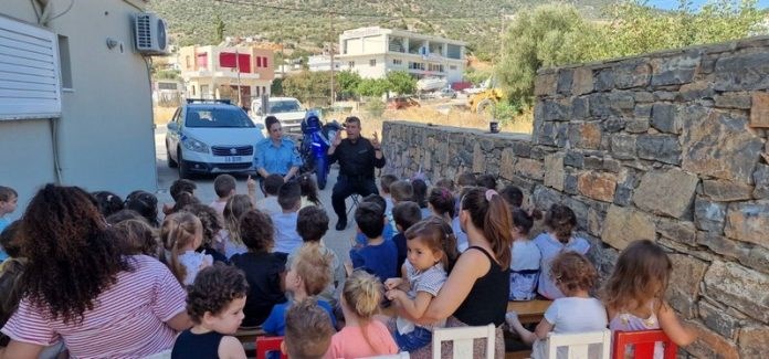 Το Τμήμα Τροχαίας Αγίου Νικολάου συνεχίζοντας τις κυκλοφοριακές δράσεις στα σχολεία της περιοχής μας, σήμερα 19 Ιουλίου επισκέφτηκε το βρεφονηπιακό σταθμό ‘Η χώρα του παραμυθιού ’ στον Άγιο Νικόλαο. Αστυνομικοί του Τμήματος Τροχαίας μίλησαν στους μικρούς μαθητές για τους βασικούς κανόνες κυκλοφοριακής αγωγής και για το επάγγελμα του αστυνομικού.