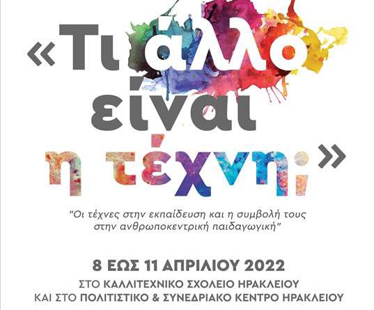 Η Περιφέρεια Κρήτης, η Περιφερειακή Διεύθυνση Εκπαίδευσης Κρήτης, το Καλλιτεχνικό Σχολείο Ηρακλείου, ο «Σύλλογος Φίλων Καλλιτεχνικού Σχολείου Ηρακλείου» και ο Δήμος Χερσονήσου με τη στήριξη του Δήμου Ηρακλείου και της πολυμετοχικής Δημοτικής Α.Ε Πολιτισμού Τουρισμού Ανάπτυξης Ηρακλείου (ΔΕΠΑΝΑΛ), υπό την αιγίδα του Υ.ΠΑΙ.Θ. και την αιγίδα του Εργαστηρίου Σκηνικής Πράξης και Λόγου του Τμήματος Θεατρικών Σπουδών Πανεπιστημίου Πατρών διοργανώνει Επιστημονικό Συνέδριο, 8 – 11 Απριλίου 2022, με θέμα: