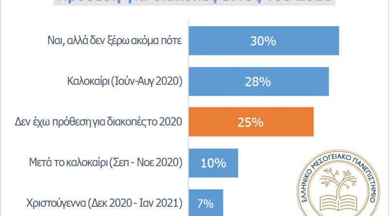 Στη γενική πρόθεση για ταξίδια αναψυχής / διακοπές εντός του 2020, το 25% δεν έχει πρόθεση να κάνει διακοπές εντός του έτους. Το 28% των ερωτηθέντων δηλώνει πρόθεση να κάνει διακοπές το καλοκαίρι (Ιούνιος – Αύγουστος 2020), το 10% το διάστημα Σεπτέμβριος – Νοέμβριος 2020, το 7% την περίοδο των Χριστουγέννων του 2020, ενώ ένα σημαντικό ποσοστό, περίπου ένας στους τρεις (30%), έχει πρόθεση για διακοπές εντός του έτους αλλά δεν ξέρει ακόμα πότε.