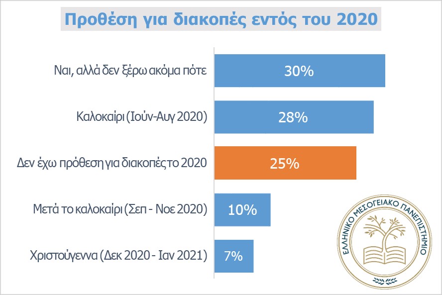 Στη γενική πρόθεση για ταξίδια αναψυχής / διακοπές εντός του 2020, το 25% δεν έχει πρόθεση να κάνει διακοπές εντός του έτους. Το 28% των ερωτηθέντων δηλώνει πρόθεση να κάνει διακοπές το καλοκαίρι (Ιούνιος – Αύγουστος 2020), το 10% το διάστημα Σεπτέμβριος – Νοέμβριος 2020, το 7% την περίοδο των Χριστουγέννων του 2020, ενώ ένα σημαντικό ποσοστό, περίπου ένας στους τρεις (30%), έχει πρόθεση για διακοπές εντός του έτους αλλά δεν ξέρει ακόμα πότε.