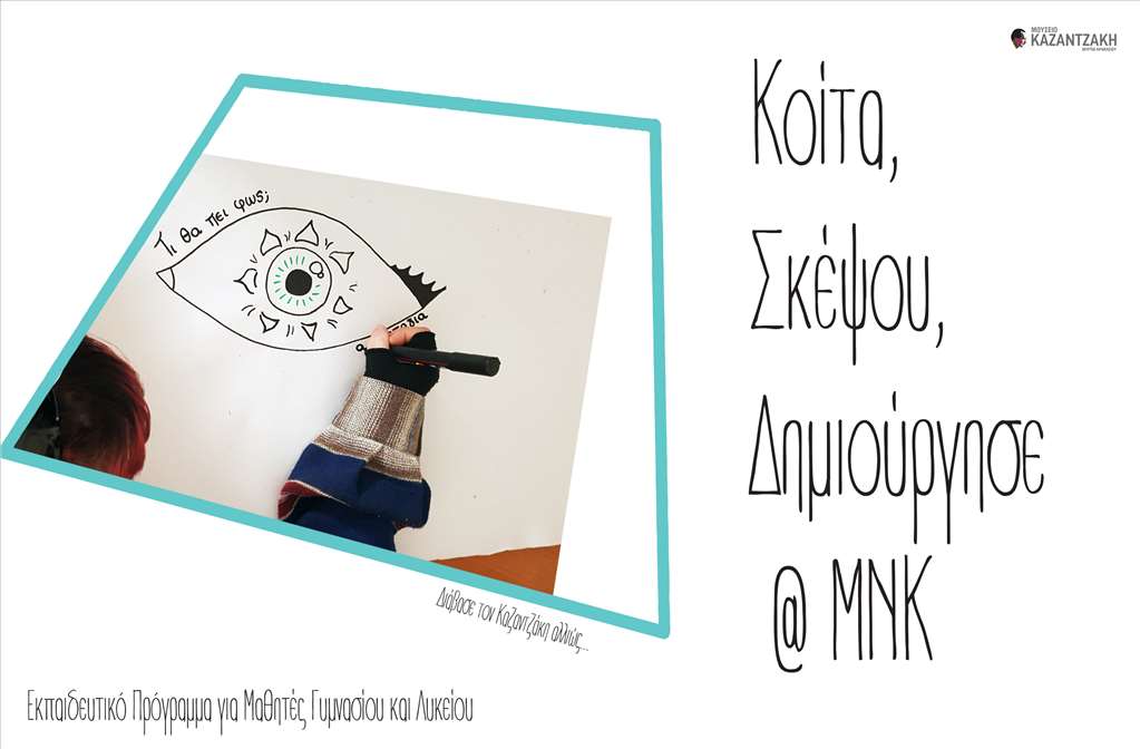 Το εκπαιδευτικό πρόγραμμα Κοίτα, Σκέψου, Δημιούργησε @ ΜΝΚ έχει σκοπό να βοηθήσει τους μαθητές να συνειδητοποιήσουν ότι ο κάθε άνθρωπος εκφράζεται με διαφορετικό τρόπο, να κατανοήσουν την αξία των τεχνών και βέβαια να δημιουργήσουν το δικό τους έργο, ένα Wheatpaste Poster, παίρνοντας έμπνευση από αποφθέγματα του Νίκου Καζαντζάκη.