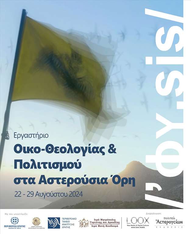 Με μεγάλη χαρά ανακοινώνουμε τη διοργάνωση του ερευνητικού προγράμματος "Εργαστήριο Οικο-Θεολογίας και Πολιτισμού στα Αστερούσια Όρη: /φυ.sis/", το οποίο θα πραγματοποιηθεί από τις 22 έως τις 29 Αυγούστου στα Αστερούσια Όρη και την Ιερά Μονή Κουδουμά, σε συνεργασία με την Περιφέρεια Κρήτης, τον Δήμο Γόρτυνας και τον Οργανισμό Έρευνας, Καινοτομίας και Πολιτισμού LOOX.