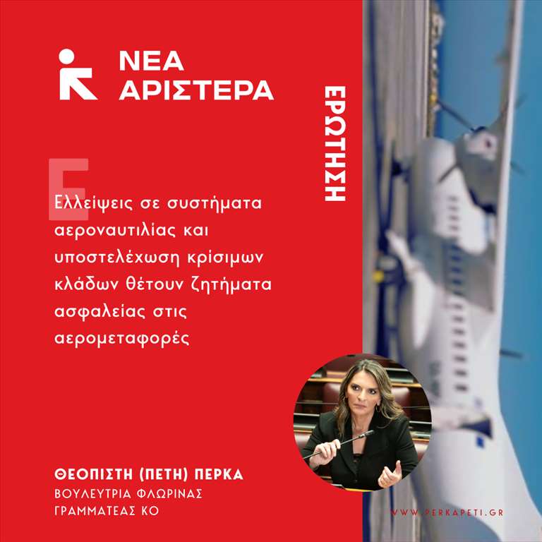 Τα ζητήματα που προκύπτουν σε σχέση με την ασφάλεια των αερομεταφορών, λόγω των ελλείψεων στα συστήματα αεροναυτιλίας και της υποστελέχωσης κρίσιμων κλάδων αναδεικνύουν με ερώτησή τους 6 Βουλευτές της Νέας Αριστεράς, έπειτα από πρωτοβουλία της Βουλεύτριας Φλώρινας και Γραμματέα της Κοινοβουλευτικής Ομάδας, Θεοπίστης (Πέτης) Πέρκα.