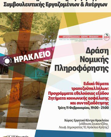 Το Εργατοϋπαλληλικό Κέντρο Ηρακλείου συνδιοργανώνει με το ΙΝΕ ΓΣΕΕ, εσπερίδα Δράση Νομικής Πληροφόρησης με τίτλο "Ειδικά θέματα τραπεζοϋπαλλήλων: Προγράμματα εθελούσιας εξόδου-Ζητήματα κοινωνικής ασφάλισης και συνταξιοδότησης".