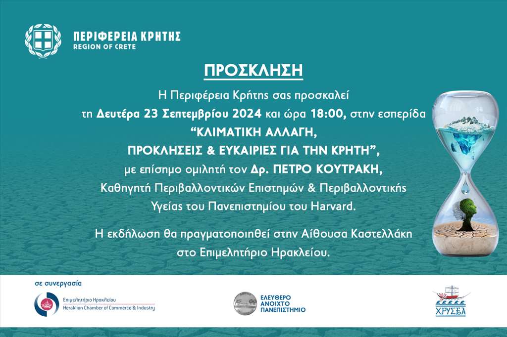 Η Περιφέρεια Κρήτης διοργανώνει απόψε εσπερίδα στο Επιμελητήριο Ηρακλείου με επίκεντρο την κλιματική αλλαγή, τις συνέπειες που έχει αλλά και τις προκλήσεις που υπάρχουν για την Κρήτη. Ομιλητής της εσπερίδας θα είναι ο Καθηγητής Περιβαλλοντικών Επιστημών & Περιβαλλοντικής Υγείας του Πανεπιστημίου του Harvard, Δρ. Πέτρος Κουτράκης που θα μιλήσει με θέμα: «Κλιματική αλλαγή, προκλήσεις και ευκαιρίες για την Κρήτη».