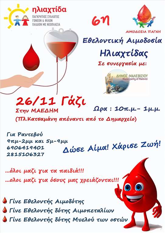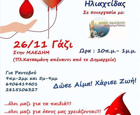 Ο Παγκρήτιος Σύλλογος Γονέων & Φίλων Παιδιών με Νεοπλασία «Η Ηλιαχτίδα», με την Αιμοδοσία του ΠΑ.Γ.Ν.Η. και τον Δήμο Μαλεβιζίου συνδιοργανώνουν εθελοντική αιμοδοσία την Πέμπτη 26 Νοεμβρίου 2020 στα γραφεία της ΜΑΕΔΗΜ τα οποία βρίσκονται στο Γάζι στην Πλατεία Μιχαήλ Κατσαμάνη απέναντι από το Δημαρχείο Μαλεβιζίου. Η αιμοδοσία θα πραγματοποιείται από τις 10:00π.μ. έως τη 1:00μ.μ. Η προσέλευση των εθελοντών αιμοδοτών θα γίνεται κατόπιν ραντεβού.