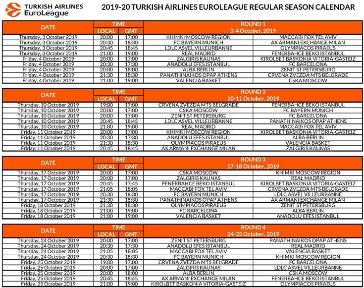 H Euroleague έκανε γνωστό όλο το πρόγραμμα της κανονικής διάρκειας της Euroleague, με το πρώτο τζάμπολ να γίνεται την Πέμπτη και Παρασκευή 3-4 Οκτωβρίου, ενώ η 34η αγωνιστική είναι προγραμματισμένη για Μεγάλη Πέμπτη και Μεγάλη Παρασκευή, 9 και 10 Απριλίου.
