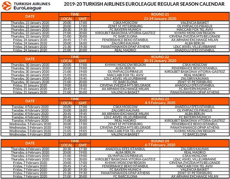 - Πέμπτη (30/01, 21:00) Ολυμπιακός – Μπασκόνια