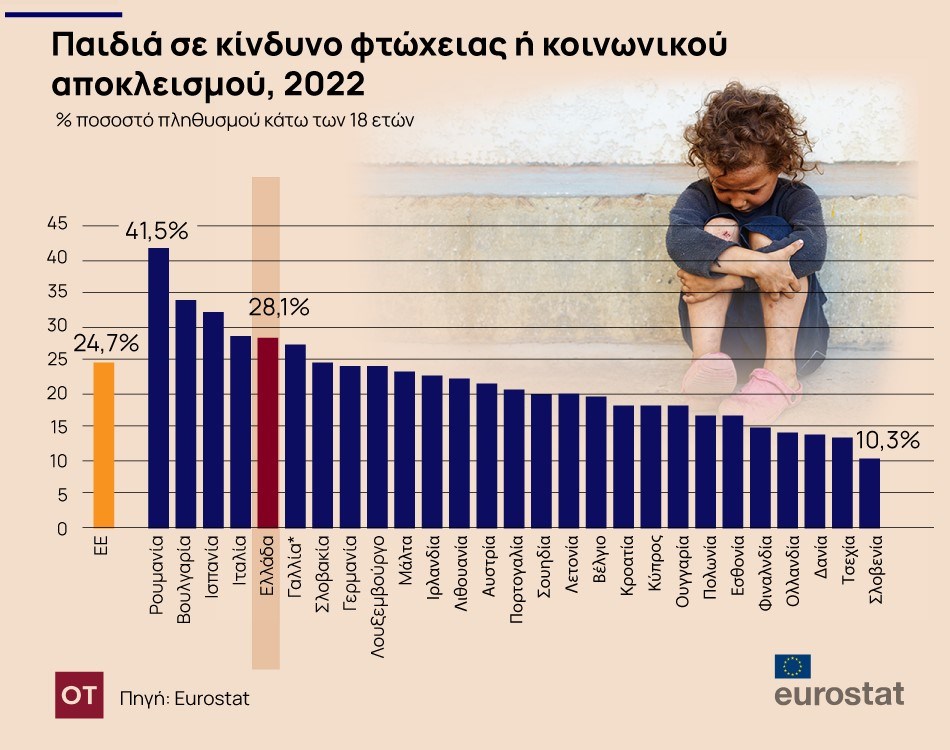 Θλιβερή διάκριση για την Ελλάδα, η πέμπτη θέση μεταξύ των 27 χωρών της ΕΕ. Στη χώρα μας το 2022, 491.000 παιδιά, που αντιστοιχεί στο 28,1% των παιδιών μέχρι 18 ετών, κοιτούσαν κατάματα το φάσμα της φτώχειας και του κοινωνικού αποκλεισμού.
