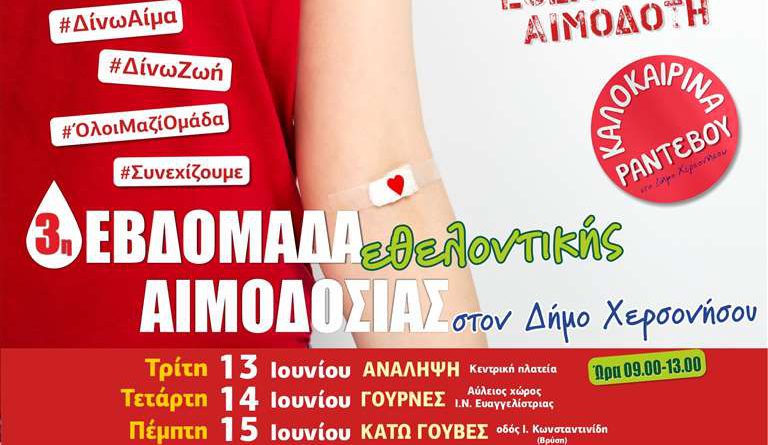 Με αφορμή την Παγκόσμια Ημέρα Εθελοντή Αιμοδότη που γιορτάζεται κάθε χρόνο στις 14 Ιουνίου, η Κοινωφελής Επιχείρηση Δήμου Χερσονήσου (Κ.Ε.Δ.Χ.) και η Κινητή Μονάδα Αιμοδοσίας του Βενιζελείου Νοσοκομείου Ηρακλείου σε συνεργασία με Πολιτιστικούς και Αθλητικούς Συλλόγους, Σχολεία, Ενορίες και Φορείς συνδιοργανώνουν την 3η Εβδομάδα Eθελοντικής Αιμοδοσίας στον Δήμο Χερσονήσου, από την Τρίτη 13 έως και τη Δευτέρα 19 Ιουνίου 2023.
