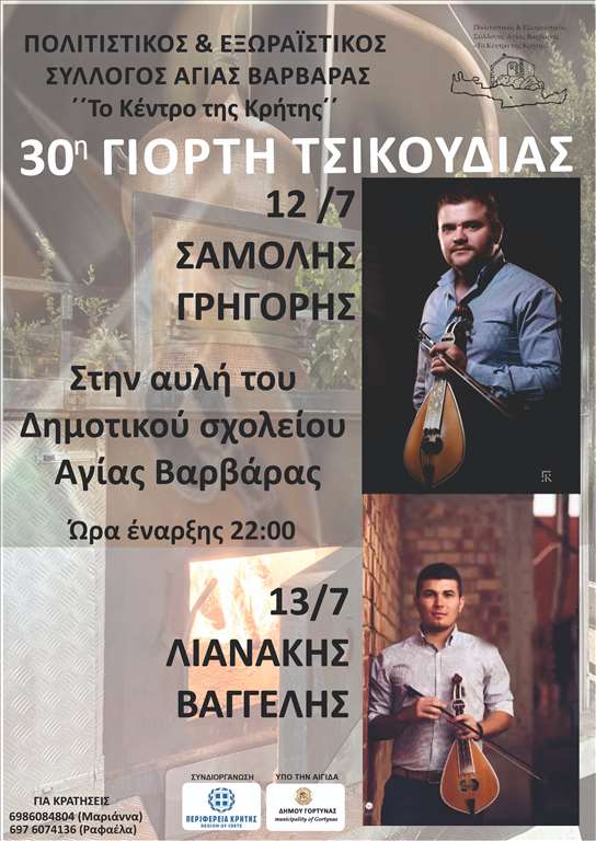 Η 30η Γιορτή Τσικουδιάς φέτος θα πραγματοποιηθεί την Παρασκευή 12 Ιουλίου και το Σάββατο 13 Ιουλίου στις 22:00 στην Αγία Βαρβάρα Ηρακλείου. Ο Πολιτιστικός Σύλλογος Αγίας Βαρβάρας με την στήριξη της Περιφέρειας Κρήτης και υπό την αιγίδα του Δήμου Γόρτυνας θα οργανώσει την γιορτή στην αυλή του Δημοτικού σχολείου του χωριού. Την πρώτη βραδιά θα τραγουδήσει ο Γρηγόρης Σαμόλης με το συγκρότημά του και την δεύτερη ο Βαγγέλης Λιανάκης με το συγκρότημά του.