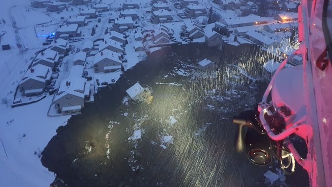 Photo made by Norwegian Air Force 330 Squadron (SAR) of the landslide that took houses and injured at least nine in Ask/Gjerdrum, Norway. Released to the press. Not all houses or what’s left of them have been checked yet, police says.#gjerdrum #gjerdrumemergency #norway pic.twitter.com/oJWnUYTpyk