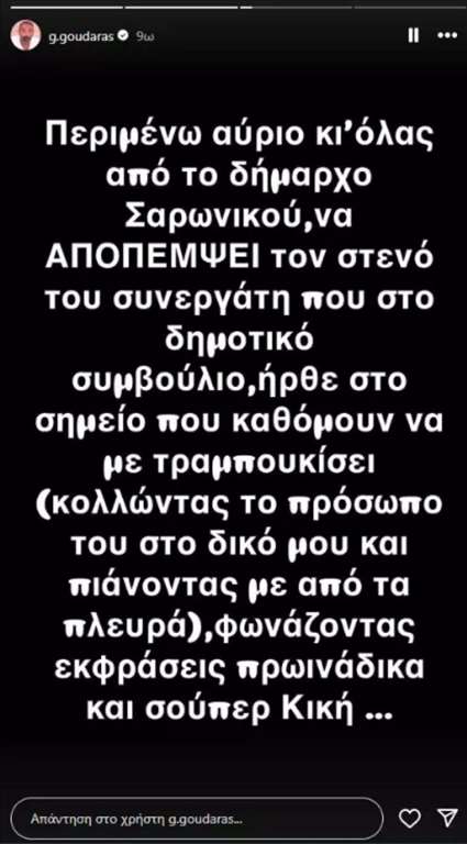 Σε insta stories που ανέβασε, ο Γρηγόρης Γκουντάρας αναφέρει: «Περιμένω αύριο κιόλας από τον Δήμαρχο Σαρωνικού να αποπέμψει τον στενό του συνεργάτη που στο δημοτικό συμβούλιο ήρθε στο σημείο που καθόμουν να με τραμπουκίσει (κολλώντας το πρόσωπό του στο δικό μου και πιάνοντάς με από τα πλευρά), φωνάζοντας εκφράσεις πρωινάδικα και Σούπερ Κική».