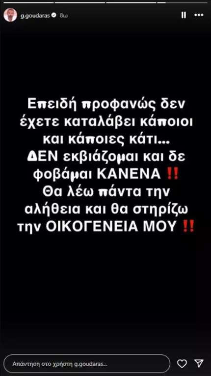 Στη συνέχεια, πρόσθεσε: «Επειδή προφανώς δεν έχετε καταλάβει κάποιοι και κάποιες κάτι… Δεν εκβιάζομαι και δεν φοβάμαι κανέναν. Θα λέω πάντα την αλήθεια και θα στηρίζω την οικογένειά μου».