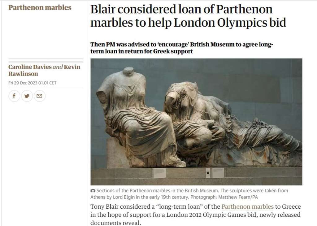 Guardian-Γλυπτά του Παρθενώνα: Ο Μπλερ εξέταζε μακροπρόθεσμο δανεισμό με αντάλλαγμα τη στήριξη του «Λονδίνο 2012»