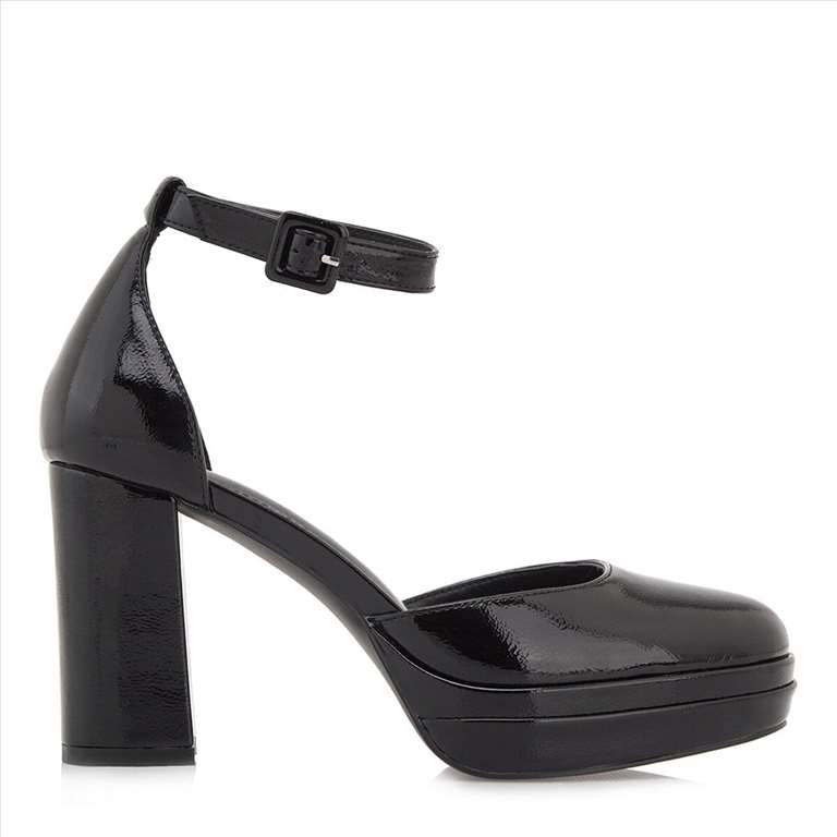 Γόβα λουστρίνι που διαθέτει λουράκι στον αστράγαλο, χοντρό τακούνι 9 εκ και φιάπα 3 εκ.