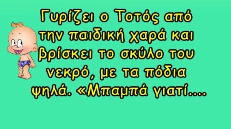 Γυρίζει ο Τοτός από την παιδική χαρά και βρίσκει το σκύλο του νεκρό, με τα πόδια ψηλά. «Μπαμπά, μπαμπά γιατί το σκυλάκι μας πέθανε με τα πόδια σηκωμένα ψηλά;» ρωτάει τον πατέρα του.