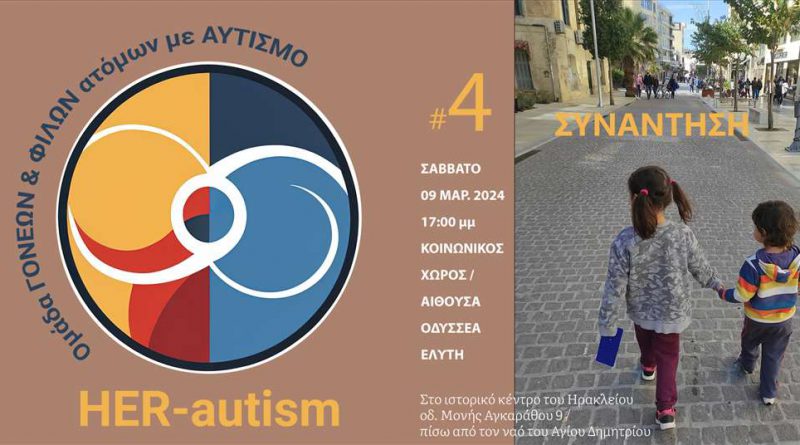 Η τέταρτη συνάντηση της εθελοντικής Ομάδας Γονέων και Φίλων Ατόμων με Αυτισμό είναι προγραμματισμένη να γίνει το Σάββατο 9 Μαρτίου 2024, ώρα 17:00, πάλι, στον Κοινωνικό Χώρο των Ιδρυμάτων Α. και Μ. Καλοκαιρινού (αίθουσα ΟΔΥΣΣΕΑ ΕΛΥΤΗ, οδ. Μονής Αγκαράθου 9). Μαζί μας θα είναι η Πρόεδρος του Δ.Σ. του Συλλόγου Ηρακλείου «Ροδαυγή» για τη νοητική αναπηρία, κυρία Γιούλα Λιαπάκη, η οποία μόλις βραβεύτηκε για το σύνολο της τριακονταετούς προσφοράς της στους συνανθρώπους μας με αόρατες αναπηρίες (Woman’s Awards 2024, 4/3/24, Πολιτιστικό και Συνεδριακό Κέντρο Ηρακλείου). Η επιχειρηματίας Τζίνα Τσαντρίζου, ενεργό μέλος της ομάδας HER-autism, απένειμε το βραβείο στην κυρία Λιαπάκη, υπό το θερμό χειροκρότημα του κοινού στην κατάμεστη κύρια Αίθουσα Ανδρέα και Μαρίας Καλοκαιρινού του ΠΣΚΗ.