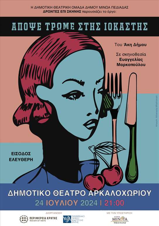 Η δημοτική θεατρική ομάδα Δήμου Μινώα Πεδιάδας «Δρώντες επι σκηνής» παρουσιάζει το έργο «απόψε τρώμε στης Ιοκάστης», με τη στήριξη της Περιφέρειας Κρήτης και ελεύθερη είσοδο, σε δύο παραστάσεις. Η πρώτη την Τετάρτη 24 Ιουλίου στις 21.00 στο Δημοτικό θέατρο Αρκαλοχωρίου και η δεύτερη στις 29 Ιουλίου στις 21.00 στο Γυμνάσιο Καστελλίου.