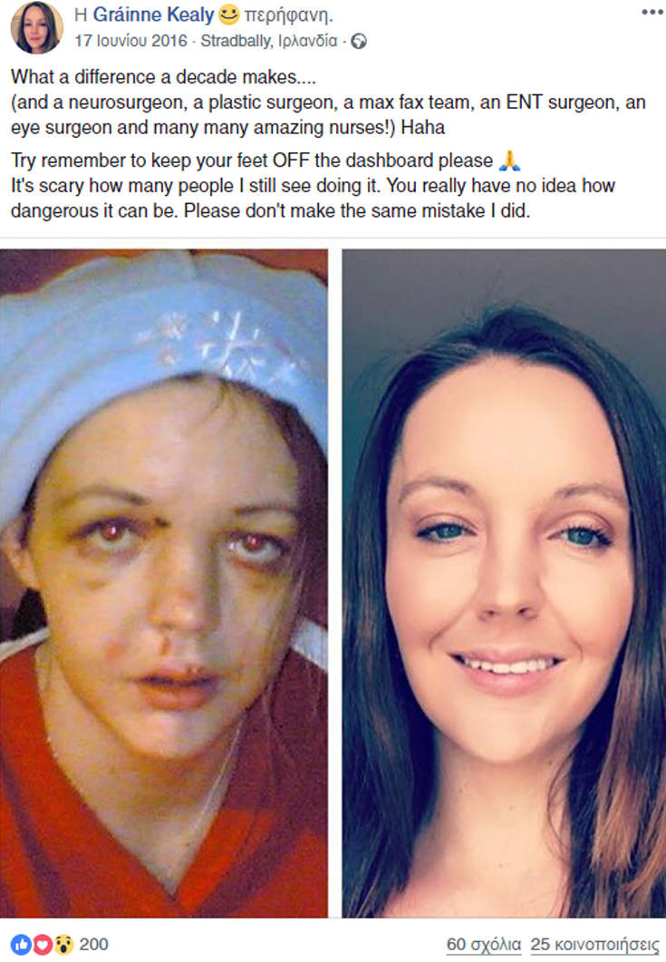 Μία γυναίκα της οποίας το μέτωπο έπρεπε να αναδιαταχθεί μετά από τροχαίο ατύχημα, προειδοποιεί τους συνοδηγούς να μην ταξιδεύουν με τα πόδια πάνω στο ταμπλό του αυτοκινήτου.