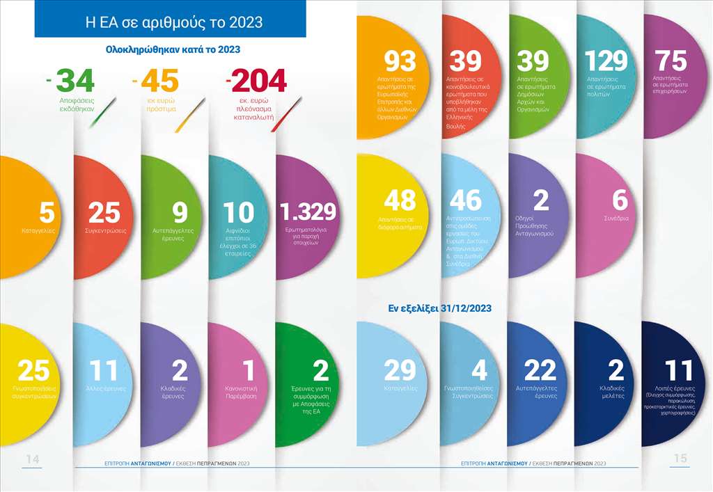 Το 2023 η Επιτροπή Ανταγωνισμού εξέδωσε πλέον των 20 αποφάσεων, μεταξύ αυτών και της υπόθεσης των τραπεζών, επέβαλε πρόστιμα άνω των 40 εκατ. ευρώ και αύξησε σημαντικά το πλεόνασμα του καταναλωτή, όχι μόνο σε σχέση με το προηγούμενο έτος (2022) αλλά και σε σχέση με την προηγούμενη δεκαετία εφαρμογής του δικαίου ανταγωνισμού. Περαιτέρω, η Επιτροπή αξιολόγησε σε βάθος ή με πιο απλοποιημένη διαδικασία σειρά εξαγορών και συγχωνεύσεων που γνωστοποιήθηκαν, πραγματοποίησε 10 επιτόπιους ελέγχους σε σχεδόν 40 εταιρείες, ολοκλήρωσε 2 κλαδικές έρευνες και μία κανονιστική παρέμβαση στον κλάδο διανομής τύπου. Το 2023 η Επιτροπή Ανταγωνισμού προέβη και σε σειρά άλλων ερευνών, όπως, μεταξύ άλλων, χαρτογραφήσεις σε σημαντικά για την ελληνική οικονομία και τον καταναλωτή προϊόντα, έλεγχο συμμόρφωσης για την τήρηση των αποφάσεών της και έρευνα για πιθανή παρακώλυση αιφνίδιου ελέγχου που διενεργήθηκε από τα στελέχη μας.