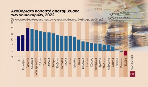 Τα υψηλότερα ακαθάριστα ποσοστά αποταμίευσης μεταξύ των χωρών της ΕΕ το 2022 καταγράφηκαν στη Γερμανία (19,9%), στην Ολλανδία (19,4%) και στο Λουξεμβούργο (18,1%).