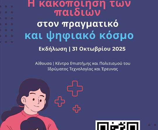 Η εκδήλωση, που θα πραγματοποιηθεί την Παρασκευή 31 Οκτωβρίου 2025, στις 12 το μεσημέρι στο Κέντρο Επιστήμης και Πολιτισμού του Ιδρύματος Τεχνολογίας και Έρευνας (οδοί Αβέρωφ και Ζωγράφου) στο Ηράκλειο, επιδιώκει να αναδείξει τις πολύπλευρες διαστάσεις της κακοποίησης των παιδιών τόσο στον φυσικό όσο και στον ψηφιακό κόσμο, συμβάλλοντας ενεργά στον διάλογο για την πρόληψη, προστασία και αποκατάσταση των παιδιών-θυμάτων.
