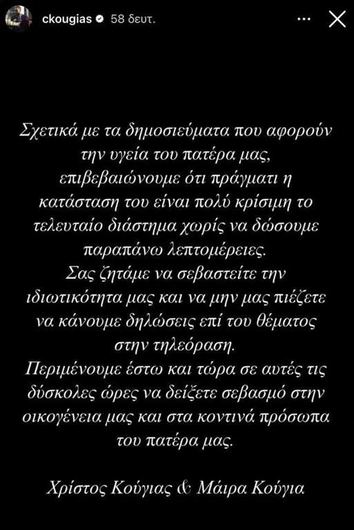 Ανακοίνωση για την κατάσταση της υγείας του Αλέξη Κούγια, ανήρτησαν τα παιδιά του μέσω διαδικτύου.