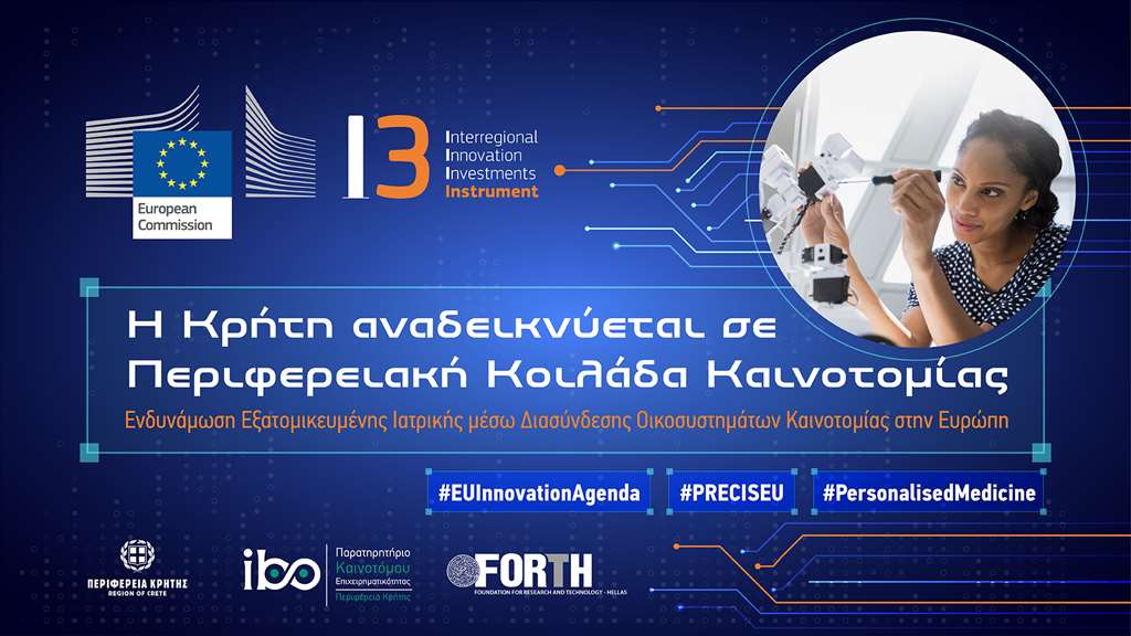 Μέσω του έργου PeRsonalised medicine Empowerment Connecting Innovation ecoSystems across Europe (PRECISEU) – (Ενδυνάμωση Εξατομικευμένης Ιατρικής μέσω Διασύνδεσης Οικοσυστημάτων Καινοτομίας στην Ευρώπη), στο πλαίσιο της Νέας Ευρωπαϊκής Ατζέντας Καινοτομίας (NEIA) και της Στρατηγικής Έξυπνης Εξειδίκευσης (RIS3) – Τομέας Αποτελεσματικής Υγείας και Ευεξίας, η Περιφέρεια Κρήτης – Παρατηρητήριο Καινοτόμου Επιχειρηματικότητας και το Ίδρυμα Τεχνολογίας και Έρευνας θα συνεργαστούν με 23 κορυφαίους φορείς καινοτομίας από 13 ευρωπαϊκές χώρες, με στόχο την: