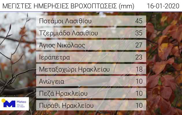Σημαντικές βροχές σημειώθηκαν από την αρχή του εικοσιτετραώρου έως το πρωί της Πέμπτης 16/01, στην Ανατολική Κρήτη.