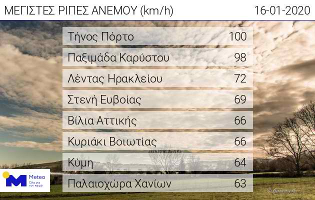 Παράλληλα, θυελλώδεις βόρειοι άνεμοι πνέουν στο Αιγαίο. Οι 8 σταθμοί που κατέγραψαν τις ισχυρότερες ριπές ανέμου παρουσιάζονται στον πίνακα που ακολουθεί.