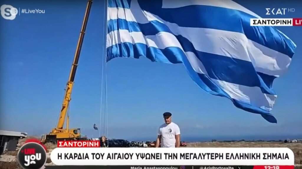 Η μεγαλύτερη ελληνική σημαία υψώθηκε στη Σαντορίνη για την 28η Οκτωβρίου. Είναι 1.500 τ.μ. και ζυγίζει περί τα 200 κιλά. Σύμφωνα με τον Αγάπιο Σκοπελίτη που κατοικεί στο νησί η σημαία έχει ύψος 30 μέτρα μήκος 50 μέτρα. «Τα καταφέραμε και φέτος! Είναι τρομερός ο ήχος όταν κάθεσαι δίπλα στη σημαία και ανεμίζει», είπε στον ΣΚΑΙ.