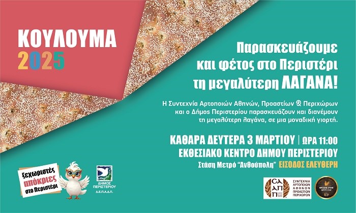 Η Συντεχνία Αρτοποιών Αθηνών, Προαστίων & Περιχώρων και ο Δήμος Περιστερίου σε μια μοναδική γιορτή θα παρασκευάσουν τη μεγαλύτερη Λαγάνα και θα διανεμηθεί στους πολίτες!