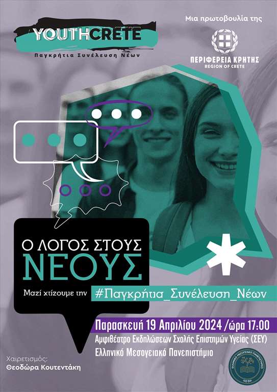 Στο πλαίσιο της Ευρωπαϊκής εβδομάδας νεολαίας (12-19 Απριλίου), η Παγκρήτια Συνέλευση Νέων (Youth Crete) πραγματοποιεί τη μεγαλύτερη μέχρι σήμερα εκδήλωσή της στο Ελληνικό Μεσογειακό Πανεπιστήμιο. Η εκδήλωση θα πραγματοποιηθεί την Παρασκευή 19 Απριλίου και ώρα 17:00 στο Αμφιθέατρο εκδηλώσεων της Σχολής Επιστημών Υγείας (ΣΕΥ) του Ελληνικού Μεσογειακού Πανεπιστημίου.
