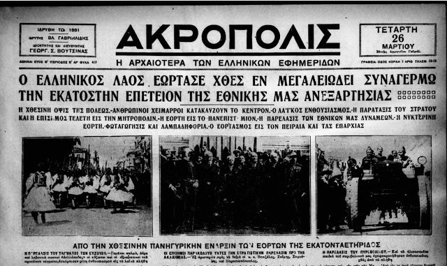Στις 25 Μαρτίου 1921 η εφημερίδα «Εμπρός» έγραφε στο σχετικό αφιέρωμα για τη συμπλήρωση ενός αιώνα από την Επανάσταση: «Ποιον άραγε μεγαλοπρεπέστερον και θριαμβευτηκότερον πανηγυρισμόν της εκατοστής επετείου της 25ης Μαρτίου ηδύνατο να ποθήσουν και να αξιώσουν αί ψυχαί των αθανάτων εκείνων Ελλήνων από τον ύμνον της Δόξας και του Θανάτου, τον οποίο εκπέμπουν σήμερον τα στόματα των Ελληνικών πυροβόλων είς τα όρη της Μικρασίας, και από την νικητήριον κραυγήν των νέων Ελλήνων ηρώων, ήτις αντηχεί παιάν απέραντος Ελληνικός εις ολόκληρον την Ανατολής, συντρίβουσα τας τελευταίας αλυσίδας της Τουρκικής τυραννίας».