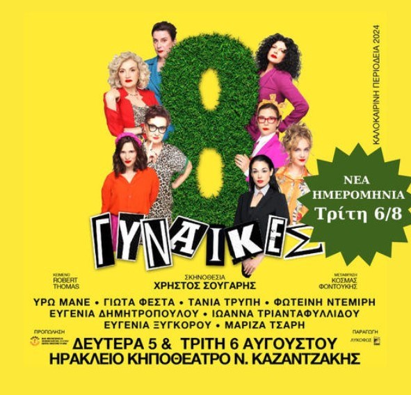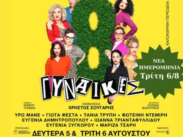 Η διάσημη αστυνομική κωμωδία του Ρομπέρ Τομά «Οκτώ Γυναίκες» ταξιδεύει φέτος το καλοκαίρι σε ολόκληρη την Ελλάδα για να προσφέρει άφθονες δόσεις γέλιου, μυστηρίου και ανατροπών, σε ένα ρεσιτάλ ερμηνειών από μια αχτύπητη γυναίκεια dream team: Υρώ Μανέ, Γιώτα Φέστα, Τάνια Τρύπη, Φωτεινή Ντεμίρη, Ευγενία Δημητροπούλου, Ιωάννα Τριανταφυλλίδου, Ευγενία Ξυγκόρου, Μαρίζα Τσάρη.