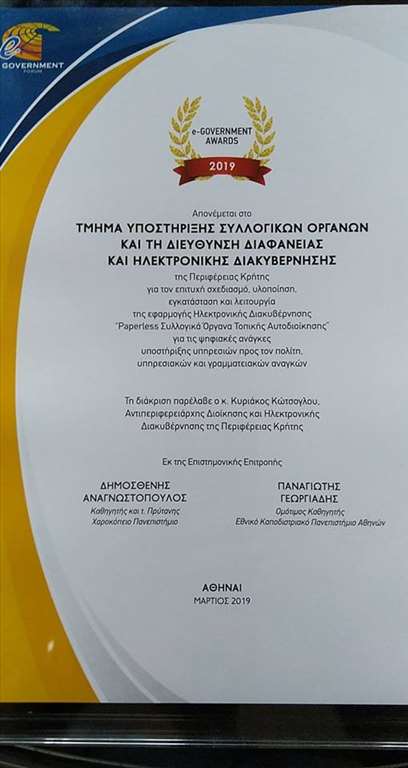 Μια νέα, πολύ σημαντική διάκριση-βράβευση, και πάλι στο τομέα της Ηλεκτρονικής Διακυβέρνησης, έλαβε η Περιφέρεια Κρήτης, και συγκεκριμένα πρόκειται για την βράβευση στο Τμήμα Υποστήριξης Συλλογικών Οργάνων και την Διεύθυνση Διαφάνειας-Ηλεκτρονικής Διακυβέρνησης.