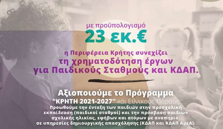 Η Περιφέρεια Κρήτης συνεχίζει τη χρηματοδότηση παιδικών σταθμών και ΚΔΑΠ με 23 εκ. ευρώ