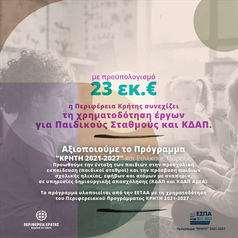 Με χρηματοδότηση του Προγράμματος ΚΡΗΤΗ 2021-2027 και Εθνικών πόρων, συνεχίζεται για δύο ακόμη χρόνια (έως και το 2027) η ένταξη των παιδιών στην προσχολική εκπαίδευση (παιδικοί σταθμοί), καθώς και η πρόσβαση παιδιών σχολικής ηλικίας, εφήβων και ατόμων με αναπηρία σε υπηρεσίες δημιουργικής απασχόλησης (ΚΔΑΠ και ΚΔΑΠ ΑμεΑ) στην Κρήτη.