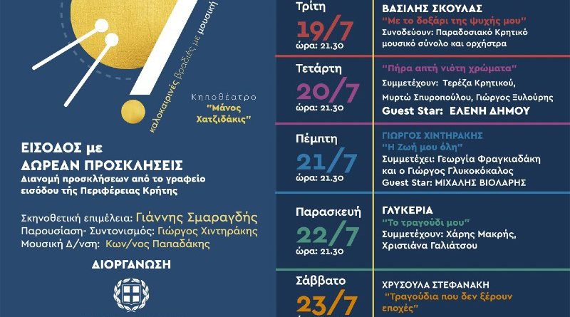 Οι πολιτιστικές εκδηλώσεις το Σαββατοκύριακο 23 και 24 Ιουλίου στα Κηποθέατρα του Δήμου Ηρακλείου