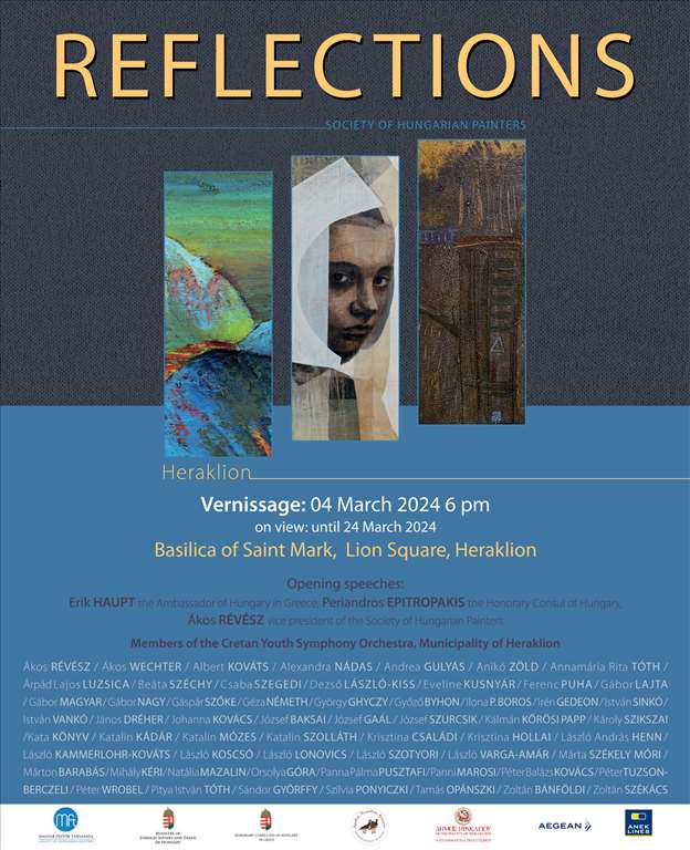 Η Πρεσβεία της Ουγγαρίας στην Αθήνα, το Επίτιμο Προξενείο της Ουγγαρίας στην Κρήτη σε συνεργασία με το Δήμο Ηρακλείου και τη Δημοτική Πινακοθήκη Ηρακλείου παρουσιάζει την εικαστική έκθεση «Reflections-Αντανακλάσεις» του Ομίλου Ούγγρων Ζωγράφων στη Βασιλική του Αγίου Μάρκου όπου θα εκτίθενται πάνω από 59 εκλεκτά έργα σύγχρονων Ούγγρων καλλιτεχνών.