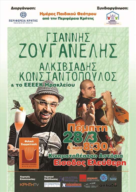 Με αφορμή την Παγκόσμια Ημέρα Θεάτρου για Παιδιά και Νέους που εορτάζεται στις 20 Μαρτίου και στο πλαίσιο των δράσεων «Ημέρες Παιδικού Θεάτρου», η Περιφέρεια Κρήτης διοργανώνει με την υποστήριξη του Ε.Ε.Ε.Ε.Κ. Ηρακλείου (Εργαστήριο Ειδικής Επαγγελματικής Εκπαίδευσης και Κατάρτισης Β/θμιας εκπαίδευσης) μουσικοθεατρική παράσταση με τον Γιάννη Ζουγανέλη και τον Αλκιβιάδη Κωνσταντόπουλο. Οι μαθητές και οι μαθήτριες του Ε.Ε.Ε.Ε.Κ. Ηρακλείου ανεβαίνουν στη σκηνή στέλνοντας το δικό τους μήνυμα.