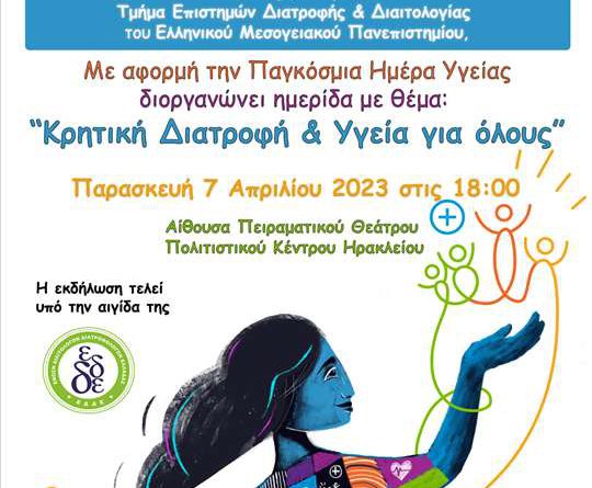 με αφορμή την Παγκόσμια Ημέρα Υγείας, διοργανώνει ημερίδα με θέμα: «Κρητική Διατροφή & Υγεία για όλους» την Παρασκευή 7 Απριλίου 2023 και ώρα 18:00