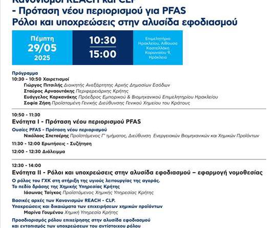 Η εκδήλωση θα πραγματοποιηθεί την Πέμπτη 29 Μαΐου 2025 στο Επιμελητήριο Ηρακλείου Αίθουσα Καστελλάκη με ώρα έναρξης στις 10:30 το πρωί. Η ημερίδα πραγματοποιείται με την στήριξη της Περιφέρειας Κρήτης σε συνεργασία με το Γραφείο Στήριξης της Βιομηχανίας και των Καταναλωτών της Διεύθυνσης Ενεργειακών Βιομηχανικών & Χημικών Προϊόντων, τη Χημική Υπηρεσία Κρήτης και το Επιμελητήριο Ηρακλείου.