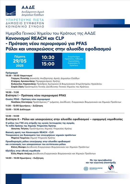 Η Γενική Διεύθυνση Γενικού Χημείου του Κράτους της Ανεξάρτητης Αρχής Δημοσίων Εσόδων, ως αρμόδια εθνική Αρχή για την εφαρμογή των κανονισμών REACH και CLP, διοργανώνει ενημερωτική ημερίδα με τίτλο: «Κανονισμοί REACH και CLP- Πρόταση νέου περιορισμού για PFAS. Ρόλοι και υποχρεώσεις στην αλυσίδα εφοδιασμού».