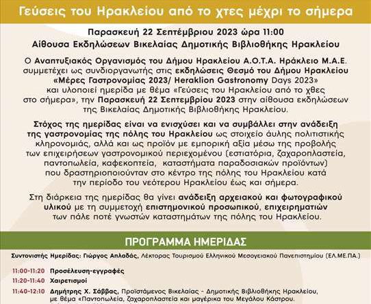 Ο Δήμος και ο Αναπτυξιακός Οργανισμός Α.Ο.Τ.Α. Ηράκλειο Μ.Α.Ε , στο πλαίσιο του φετινού Φεστιβάλ «Μέρες Γαστρονομίας 2023/Heraklion Gastronomy Days 2023» διοργανώνουν ημερίδα με θέμα «Γεύσεις του Ηρακλείου από το χθες στο σήμερα», το πρωί της Παρασκευή 22 Σεπτεμβρίου 2023 (11.00 με 14.00), στην αίθουσα εκδηλώσεων της Βικελαίας Δημοτικής Βιβλιοθήκης Ηρακλείου (Μέγαρο Αχτάρικα, 2ος Όροφος).