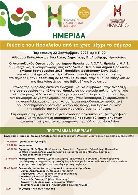 Ο Δήμος και ο Αναπτυξιακός Οργανισμός Α.Ο.Τ.Α. Ηράκλειο Μ.Α.Ε , στο πλαίσιο του φετινού Φεστιβάλ «Μέρες Γαστρονομίας 2023/Heraklion Gastronomy Days 2023» διοργανώνουν ημερίδα με θέμα «Γεύσεις του Ηρακλείου από το χθες στο σήμερα», το πρωί της Παρασκευή 22 Σεπτεμβρίου 2023 (11.00 με 14.00), στην αίθουσα εκδηλώσεων της Βικελαίας Δημοτικής Βιβλιοθήκης Ηρακλείου (Μέγαρο Αχτάρικα, 2ος Όροφος).